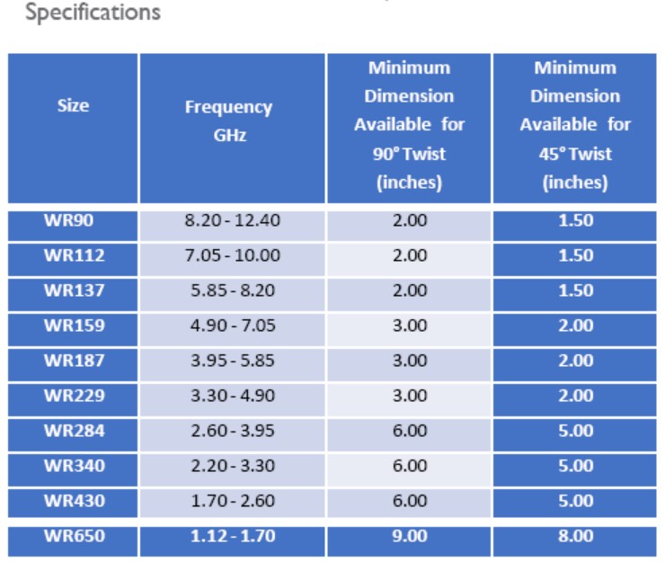 UBS offers a custom product line of Electroformed step twist covering waveguide sizes from WR-90 through