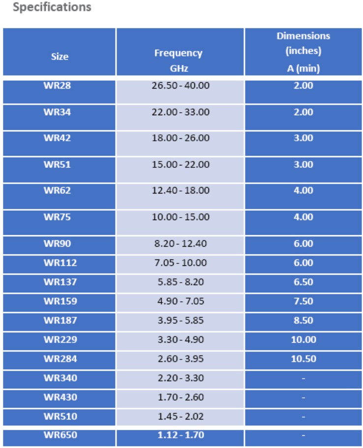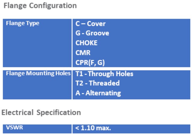 UBS’ standard precision low-power terminations product line uses spear load elements for optimum electrical performance. Maximum power handling capacity: 0.5 watts for waveguide sizes WR-28 to WR-42, 1 watt for WR- 51 and WR-62, and 2 watts for waveguide sizesWR-75 to WR-650.