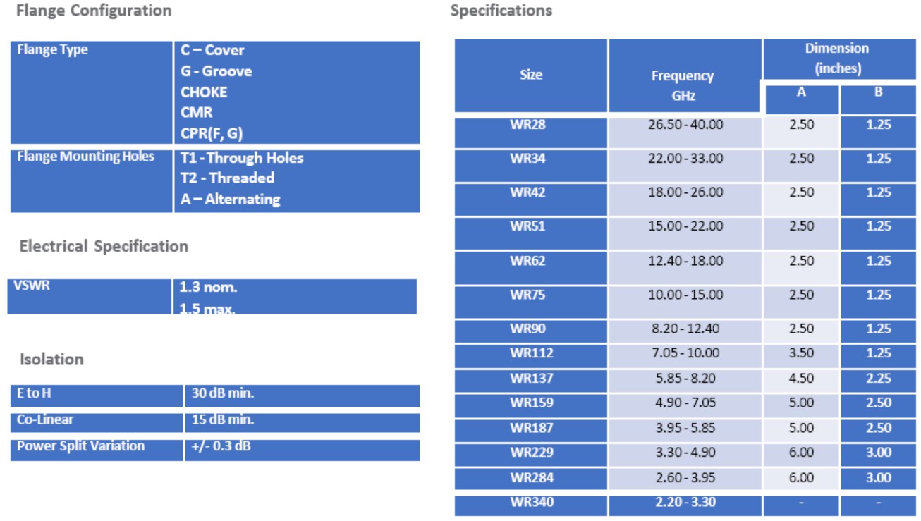 UBS offers a standard product line of isolated four-port hybrid power dividers covering waveguide sizes fromWR-28 through WR-340.